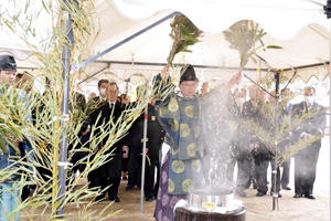 初午祭は、無火災と商売繁昌を祈る伝統行事。境内の一角で執り行われた湯立ての神事では、丹治正博宮司が大釜にクマササの束を浸し、湯しぶきを浴びながら火を鎮めた。